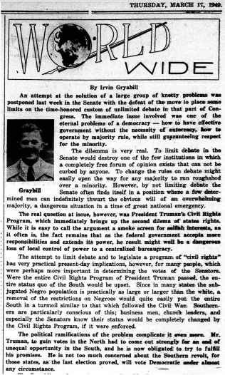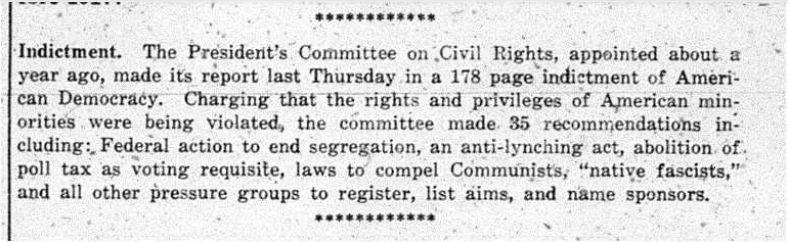 This 1947 edition of the Bucknellian’s World Wide Column addresses the report released by President Truman’s Committee on Civil Rights, in which the committee confronts the problem of rights and privilege violations against minorities. Additionally, the report interrogates the narrative of American Democracy—namely, that minorities have been historically excluded from accessing its benefits. In response, the committee makes 35 recommendations to improve the status of Civil Rights in the U.S., some of which include the end of segregation and the passage of an anti-lynching act.