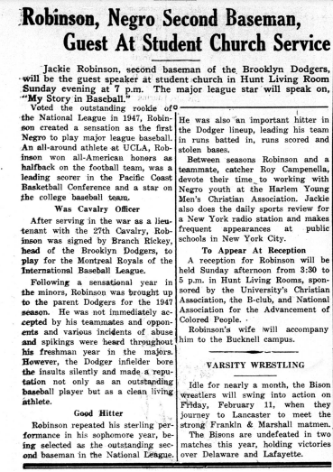 This Bucknellian article from February 1949 details famous athlete Jackie Robinson’s (1919-1972) upcoming visit to campus where he would speak at the student chapel and attend a reception. This article also gives background on Robinson’s life and accomplishments as the first black man to break into major league athletics through baseball.