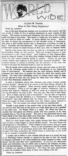 This 1950 edition of the Bucknellian’s World Wide Column features a scathing criticism of prejudice and discrimination in the U.S. as being antithetical to the essence of American Democracy. Citing headlines that highlight the widespread violence occurring against minorities, the author urges readers to confront prejudice at its core. The article also notes that many of those affected by discrimination were once involved with the military, where they served to protect the very democratic ideals that they are excluded from experiencing upon returning home. With a final call to not only gaze beyond the superficialities of identity on an individual level, but to more largely interrogate prejudice and discrimination from the perspective of democracy, the author concludes with a demand for equal opportunities for all peoples.